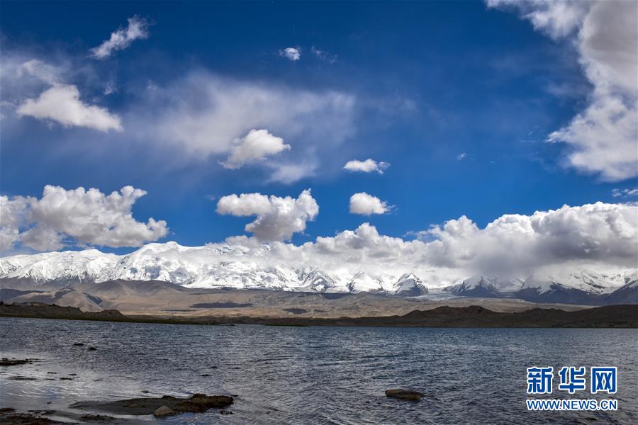 帕米爾高原上喀拉庫勒湖畔連綿的雪山(6月16日攝)。