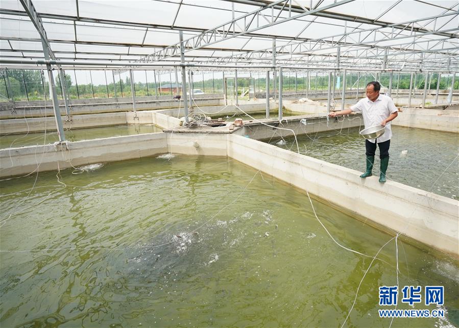 6月16日,在盧龍縣印莊鄉(xiāng)榆林甸村永新水產(chǎn)養(yǎng)殖專(zhuān)業(yè)合作社的養(yǎng)殖基地,養(yǎng)殖戶劉玉永在給淡水鱸魚(yú)投放飼料。