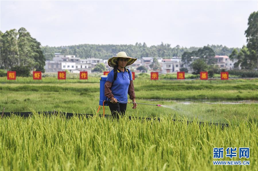 6月17日,在廣西武宣縣祿新鎮(zhèn)上堂村稻蝦輪作養(yǎng)殖示范基地,村民在給水稻施肥。新華社記者 曹祎銘 攝