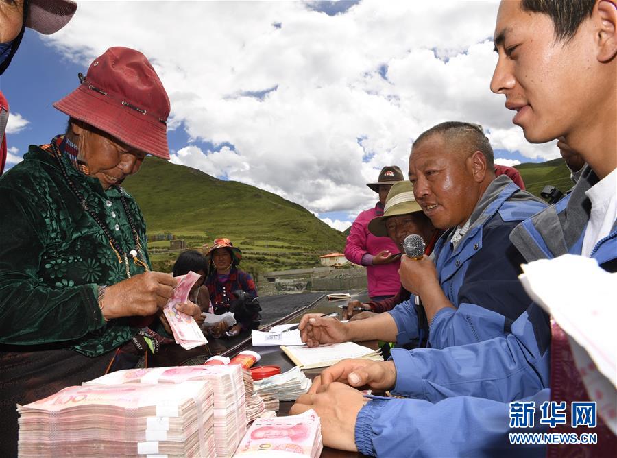 6月13日,壤塘縣尕多鄉(xiāng)瑟谷村熱不卡小組村民領(lǐng)取在蔬菜基地務(wù)工的工資。新華社記者 劉坤 攝