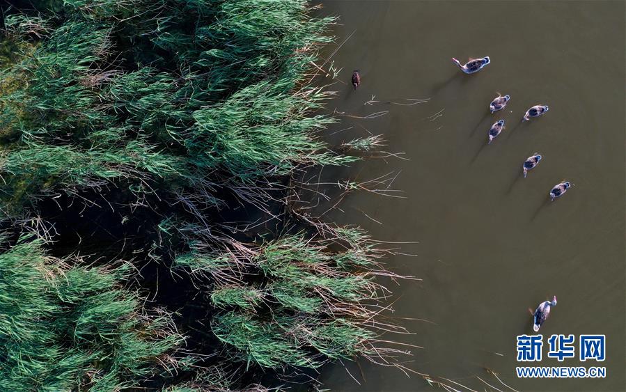 6月19日,一群鴨子在新疆烏倫古湖國家濕地公園覓食(無人機照片)。烏倫古湖國家濕地公園位于新疆阿勒泰地區(qū)福??h城以西,由烏倫古湖和吉力湖兩部分組成。烏倫古湖濕地公園是遷徙候鳥飛越天山和阿爾泰山的“能量補充站”,良好的濕地生態(tài)吸引著大量遷徙鳥類在此集結(jié)成群,繁殖棲息,成為一道靚麗的風景線。新華社記者 沙達提 攝