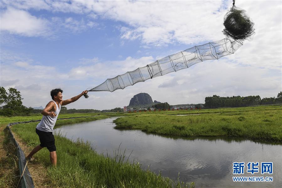 6月17日,在廣西武宣縣祿新鎮(zhèn)上堂村稻蝦輪作養(yǎng)殖示范基地,村民將捕蝦籠拋入蝦塘中。新華社記者曹祎銘攝