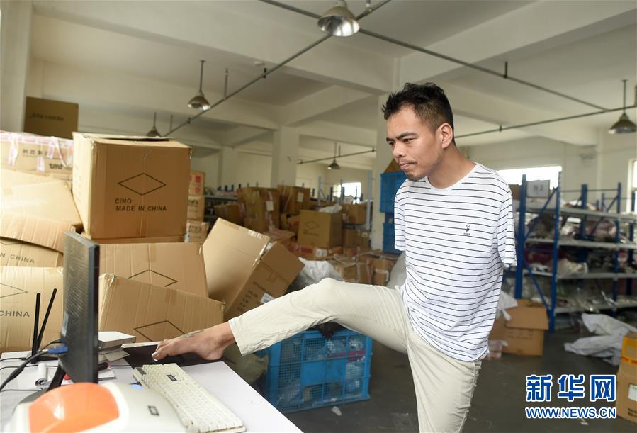 6月12日,金江偉用腳控制鼠標(biāo)打印網(wǎng)店訂單。今年34歲的金江偉是浙江省諸暨市楓橋鎮(zhèn)樂山村村民。5歲時(shí)的一場意外讓他失去了雙臂,但金江偉沒有向命運(yùn)屈服。從2016年起,金江偉和弟弟開始在電商領(lǐng)域創(chuàng)業(yè),開網(wǎng)店銷售襪子,金江偉負(fù)責(zé)網(wǎng)店策劃和客服。經(jīng)過苦練,他用腳打字的速度已經(jīng)與常人無異。在他的努力下,這幾年網(wǎng)店年銷售額超過100萬元。新華社記者韓傳號(hào)攝