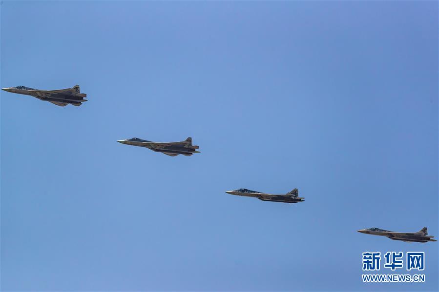 6月20日,在俄羅斯首都莫斯科,蘇-57戰(zhàn)斗機(jī)編隊(duì)參加閱兵式彩排。俄羅斯將于6月24日舉行紀(jì)念衛(wèi)國(guó)戰(zhàn)爭(zhēng)勝利75周年閱兵式。新華社記者白雪騏攝