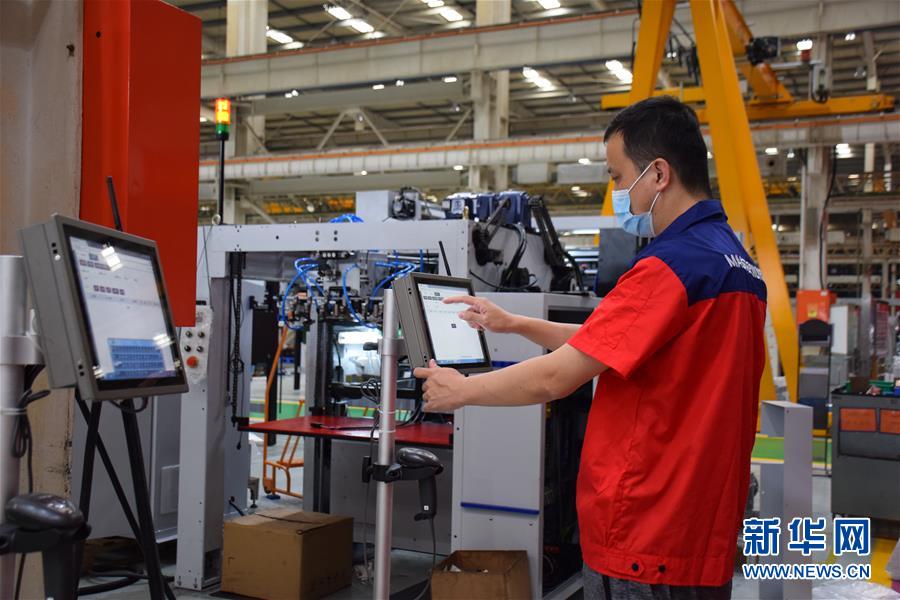 天津長榮科技集團股份有限公司的工人在查看生產(chǎn)情況(6月18日攝)。新華社記者白佳麗攝