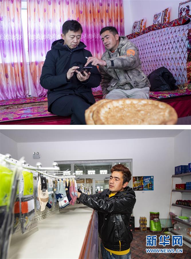 拼版照片:上圖為新疆塔什庫爾干塔吉克自治縣扶貧工作人員付超(左)向都熱·加爾曼的小兒子征求就業(yè)創(chuàng)業(yè)意愿(2019年11月25日攝);下圖為都熱·加爾曼的小兒子通過小額貸款在易地扶貧搬遷安置點開辦了小商店(6月2日攝)。新華社記者胡虎虎攝