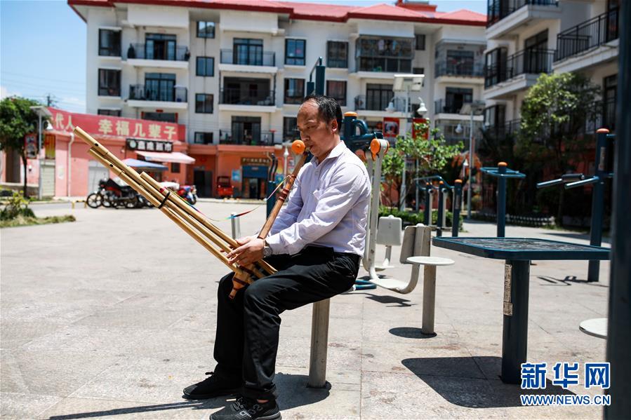 在貴州省惠水縣明田街道易地扶貧搬遷項目新民社區(qū),居民羅應和在新居旁吹蘆笙(5月6日攝)。新華社記者歐東衢攝