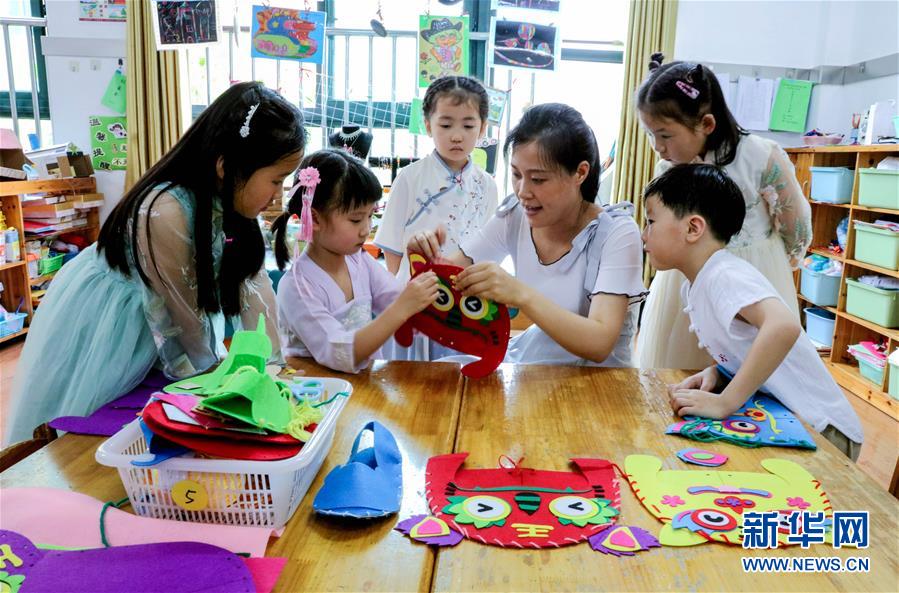 6月23日,長(zhǎng)興縣開(kāi)發(fā)區(qū)實(shí)驗(yàn)幼兒園的孩子們?cè)诮處熤笇?dǎo)下學(xué)做虎頭鞋、虎頭帽。為了迎接即將到來(lái)的端午節(jié),浙江省湖州市長(zhǎng)興縣各個(gè)幼兒園開(kāi)展“品民俗迎端午”主題活動(dòng),讓小朋友們體驗(yàn)傳統(tǒng)民俗文化。新華社記者徐昱攝
