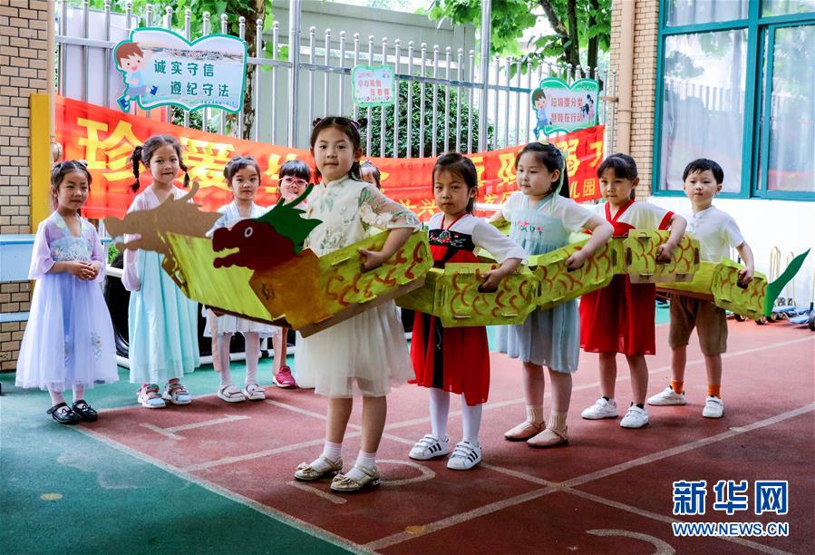 6月23日,長興縣開發(fā)區(qū)實驗幼兒園的孩子們用廢舊的紙箱做成“龍舟”進(jìn)行表演。為了迎接即將到來的端午節(jié),浙江省湖州市長興縣各個幼兒園開展“品民俗迎端午”主題活動,讓小朋友們體驗傳統(tǒng)民俗文化。新華社記者徐昱攝