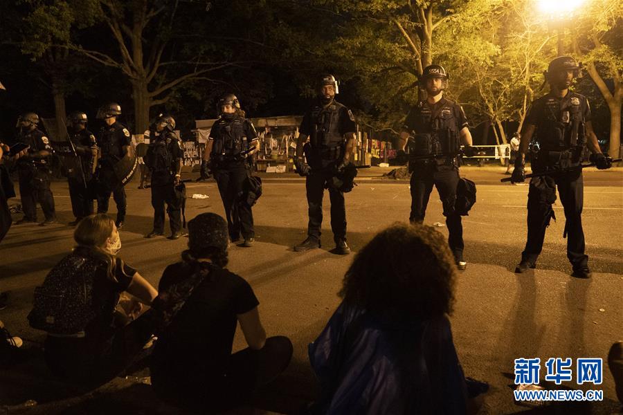 6月22日,警察和示威者在美國(guó)華盛頓白宮附近對(duì)峙。美國(guó)警察和示威者22日晚在首都華盛頓市白宮北側(cè)拉斐特廣場(chǎng)發(fā)生沖突并對(duì)峙。美國(guó)總統(tǒng)特朗普在社交媒體上說,許多人因破壞廣場(chǎng)上美國(guó)前總統(tǒng)安德魯·杰克遜的雕像及附近圣約翰圣公會(huì)教堂被逮捕。新華社記者劉杰攝