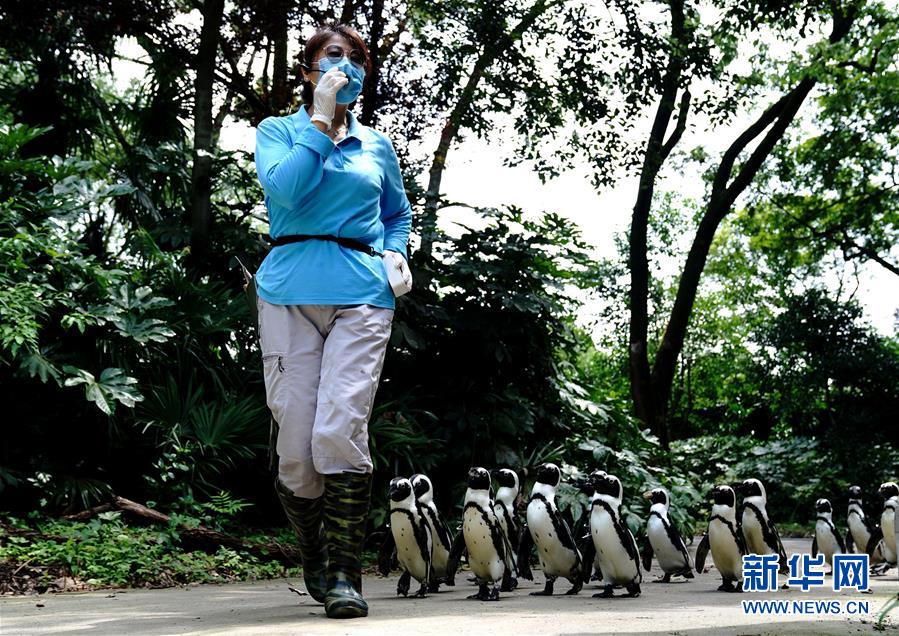 6月26日,上海動物園飼養(yǎng)員引導(dǎo)企鵝在園內(nèi)漫步。端午小長假第二天,上海動物園開展“企鵝漫步科普行”活動,受到游客歡迎。新華社記者 張建松 攝