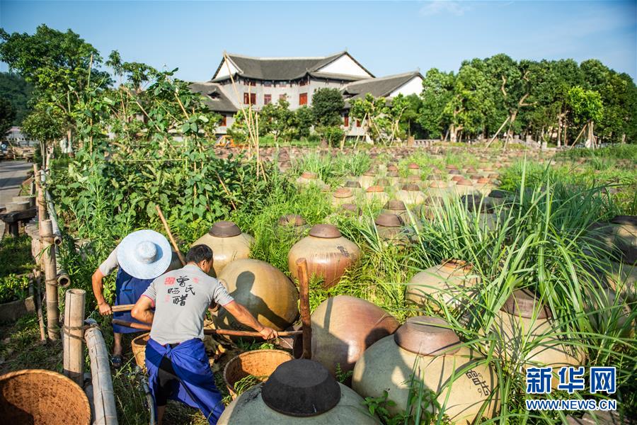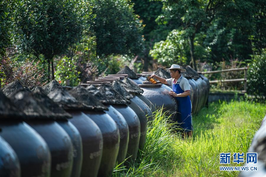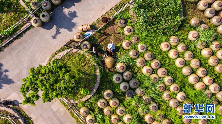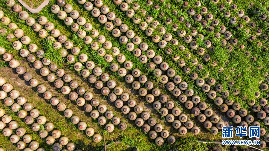 赤水曾氏曬醋廠(chǎng)晾曬的醋壇(6月26日攝,無(wú)人機(jī)照片)?!俺嗨畷翊住辈捎霉腆w發(fā)酵繁殖產(chǎn)生天然醋酸菌,醋醅和成品醋都在日光下曝曬而成,故稱(chēng)曬醋?!俺嗨畷翊住敝谱鳉v史悠久,工序考究,2009年被列入貴州省級(jí)非遺名錄。新華社記者 陶亮 攝