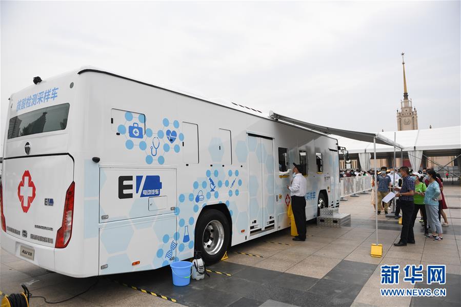 6月28日,在北京市西城區(qū)北京展覽館南側(cè)的露天廣場(chǎng)核酸檢測(cè)采樣點(diǎn),前來做檢測(cè)的人員在核酸檢測(cè)采樣車旁進(jìn)行采樣。新華社記者鞠煥宗攝