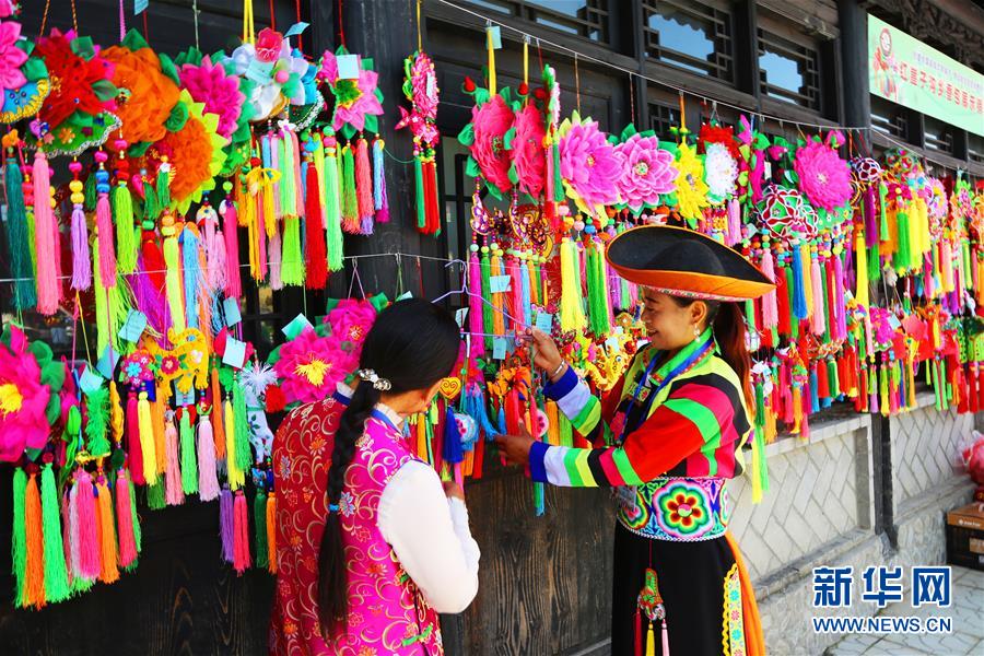 6月24日,繡娘在青海省互助土族自治縣舉辦的端午節(jié)香包“選美”大賽上交流。新華社記者解統(tǒng)強攝