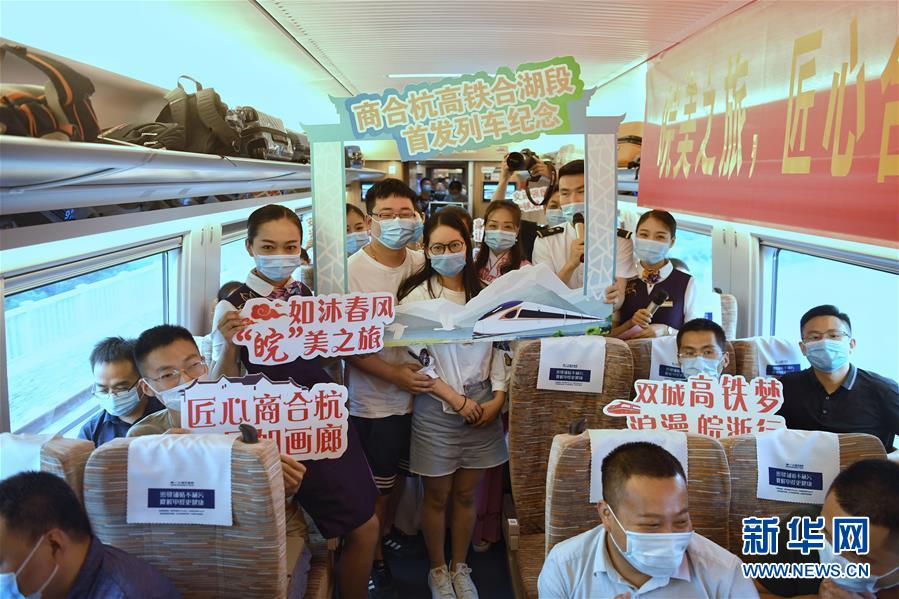 6月28日,在合肥南站,合肥客運(yùn)段工作人員和旅客在合肥南至杭州東的G9394次列車上合影。新華社記者劉軍喜攝