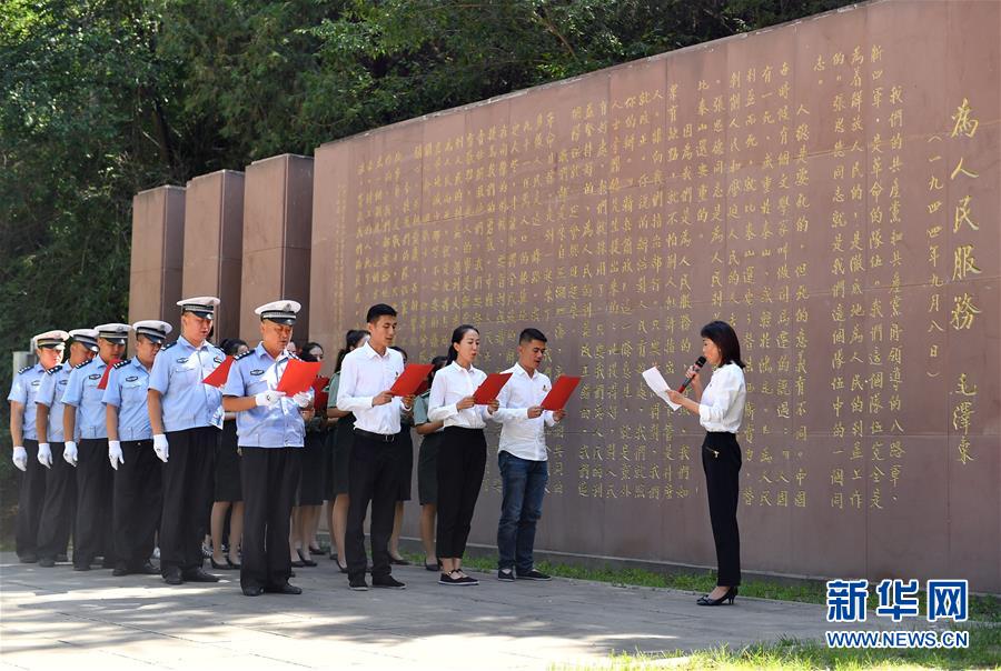 6月29日,在延安市張思德廣場,黨員干部在誦讀《為人民服務(wù)》。臨近“七一”,革命圣地延安的黨員干部紛紛來到紅色景區(qū),舉行主題黨課、現(xiàn)場教學、重溫入黨誓詞等活動。新華社記者張博文攝