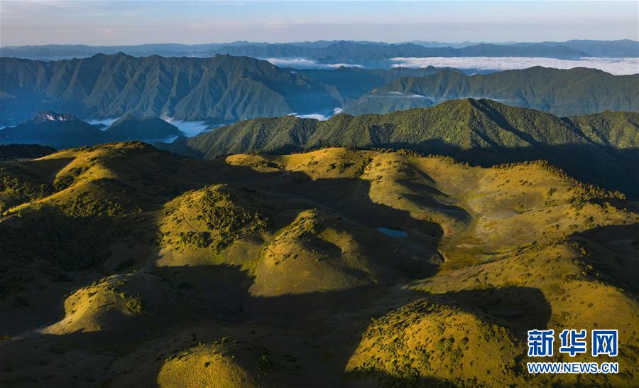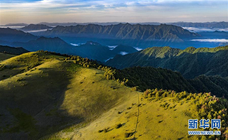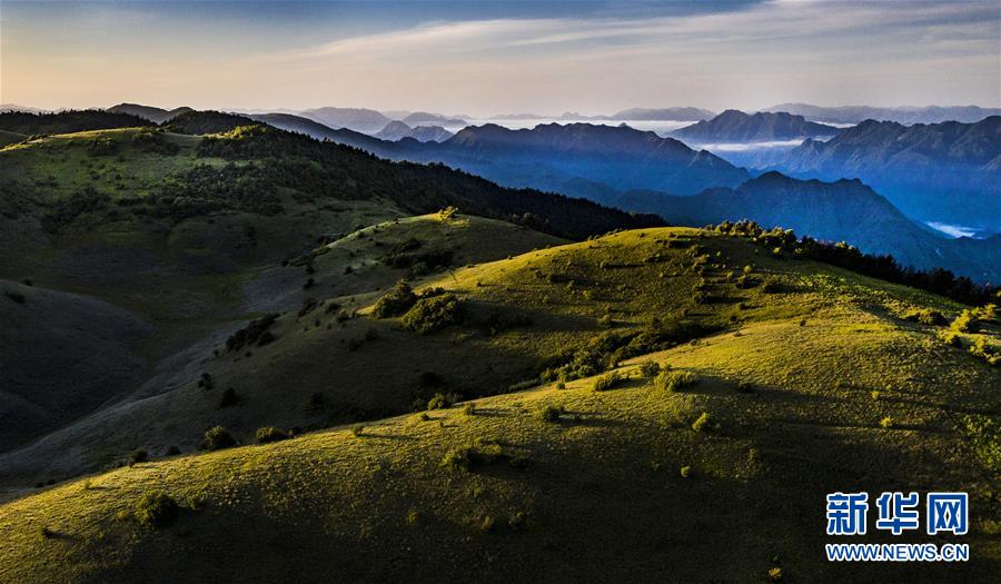 6月30日,朝霞照耀下的神田草甸與遠處的群峰(無人機照片)。位于陜西省安康市嵐皋縣與重慶市城口縣交界處大巴山神田主脊北坡的神田草甸,面積超過1.1萬畝。夏日的朝霞中,起伏的草甸仿佛一塊寬大無邊的綠色地毯,鑲嵌在大巴山上,如詩如畫。新華社記者陶明攝