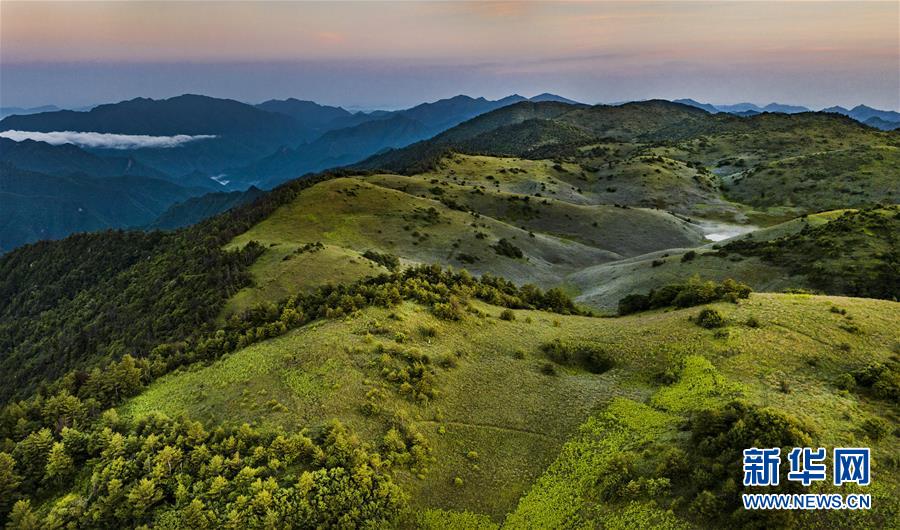 6月30日,晨曦中的神田草甸(無人機照片)。位于陜西省安康市嵐皋縣與重慶市城口縣交界處大巴山神田主脊北坡的神田草甸,面積超過1.1萬畝。夏日的朝霞中,起伏的草甸仿佛一塊寬大無邊的綠色地毯,鑲嵌在大巴山上,如詩如畫。新華社記者陶明攝