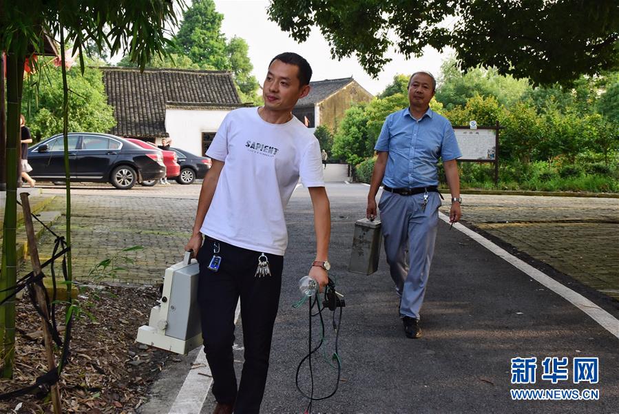 6月30日,朱生榮(右)和兒子朱強(qiáng)(左)攜帶放映設(shè)備來到馬鳴村將軍湖廣場(chǎng)。新華社記者鄭夢(mèng)雨攝