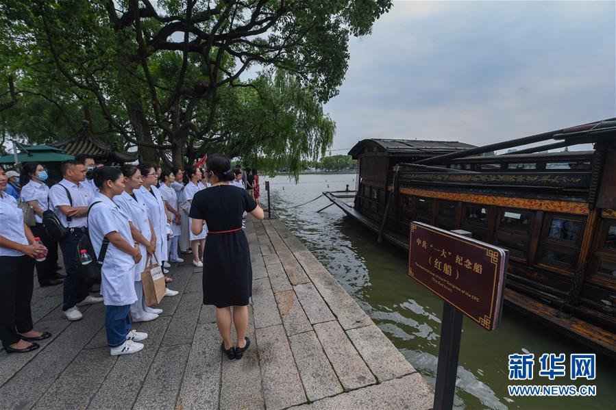7月1日,嘉興市新冠肺炎疫情抗疫一線黨員在南湖景區(qū)的中共一大紀(jì)念船邊參加“七一”活動。新華社記者徐昱攝