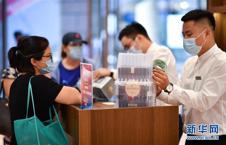 7月1日,海口日月廣場(chǎng)免稅店的工作人員為顧客打包酒類商品。當(dāng)日,海南開始實(shí)施調(diào)整后的離島免稅購(gòu)物政策。海南離島旅客每年每人免稅購(gòu)物額度提高至10萬元,電子消費(fèi)產(chǎn)品等7類新增商品開售。新華社記者郭程攝