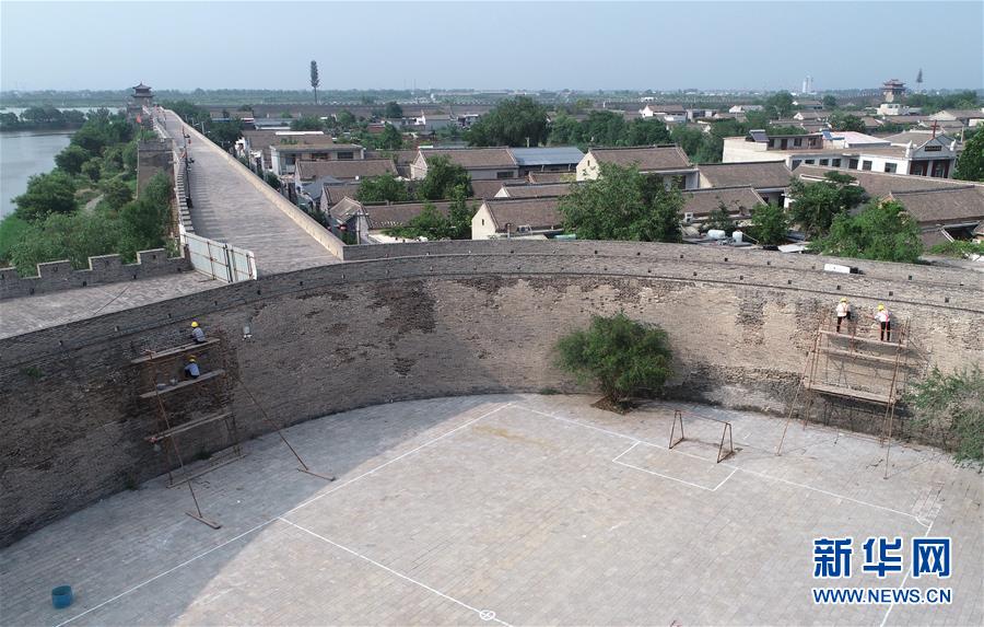 7月2日,工作人員在永年廣府古城修繕城墻(無人機(jī)照片)。經(jīng)國(guó)家文物局和河北省文物局批準(zhǔn),河北永年廣府古城修繕工程已全面啟動(dòng)。在文物專家全程參與下,按照“不改變文物原狀”原則進(jìn)行修繕,預(yù)計(jì)2021年4月底完工。永年廣府古城擁有華北地區(qū)保存最完整的古城墻,現(xiàn)為全國(guó)重點(diǎn)文物保護(hù)單位。新華社記者王曉攝