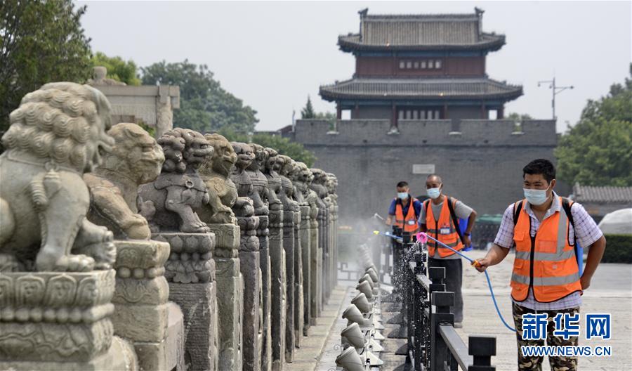 7月4日,防疫人員在盧溝橋景區(qū)進行環(huán)境消毒。當日,北京市豐臺區(qū)組織防疫人員、安全監(jiān)察部門人員對社區(qū)、超市、公共場所進行大規(guī)模環(huán)境消毒及疫情隱患排查,全力保障市民生活和工作環(huán)境安全。新華社記者 李欣 攝