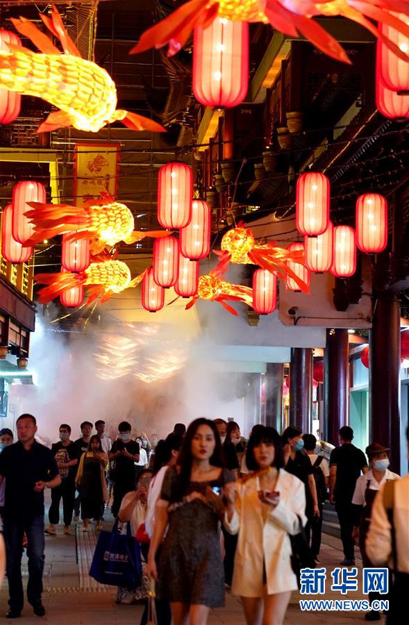 7月3日在上海豫園拍攝的燈景。從7月第一個周末起,上海豫園原有的“豫園六點半”集市全面升級,煥彩燈光、演藝活動和花車集市全線更新,讓市民和游客在觀燈、觀人、觀演的沉浸式體驗中,享受夏日特色的“食玩”樂趣。新華社記者 劉穎 攝