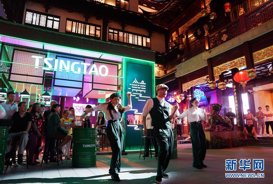 7月3日,游人在上海豫園中心廣場觀看街舞表演。從7月第一個周末起,上海豫園原有的“豫園六點半”集市全面升級,煥彩燈光、演藝活動和花車集市全線更新,讓市民和游客在觀燈、觀人、觀演的沉浸式體驗中,享受夏日特色的“食玩”樂趣。新華社記者 劉穎 攝