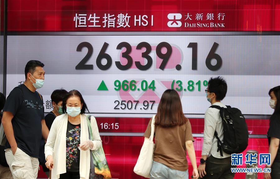 7月6日,人們從位于香港中環(huán)的股市信息屏前經(jīng)過(guò)。香港恒生指數(shù)6日漲966.04點(diǎn),漲幅3.81%,收?qǐng)?bào)26339.16點(diǎn)。全日主板成交2507.97億港元。新華社記者李鋼攝