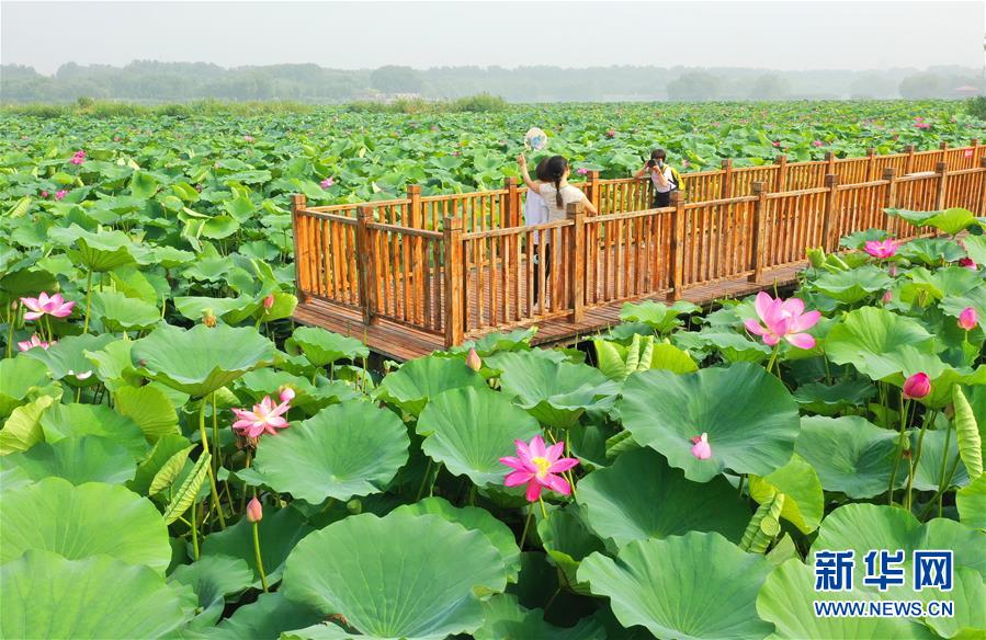 7月7日,游客在唐山市南湖公園的觀荷棧橋上拍照(無人機照片)。近日,河北省唐山市南湖公園內(nèi)荷花競相綻放,呈現(xiàn)出“接天蓮葉無窮碧,映日荷花別樣紅”的美麗景象,吸引了眾多游客前來觀賞。新華社記者楊世堯攝