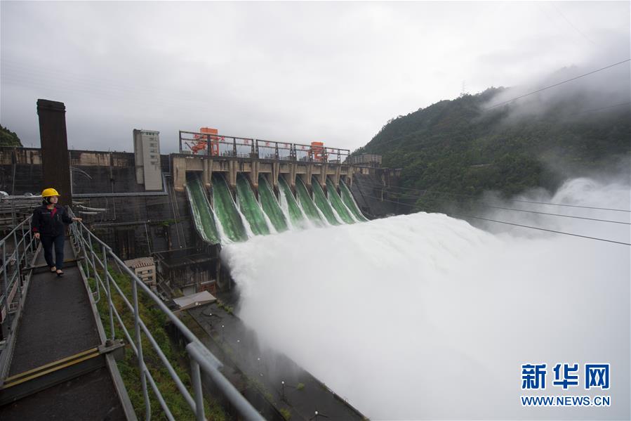 7月8日,新安江水庫開啟9孔泄洪,新安江電廠工作人員在壩區(qū)巡視。當日上午10時,新安江水庫水位108.42米,超汛限水位1.92米,且持續(xù)上漲。繼7日10時開啟3孔、12時開啟5孔、16時開啟7孔泄洪后,水庫于8日打開全部9個泄洪閘泄洪,這在水庫建成運營61年來尚屬首次。新安江水庫是華東地區(qū)最大的水庫,在錢塘江流域的防洪度汛中起到關鍵作用。新華社記者翁忻旸攝