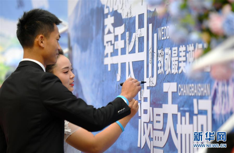 7月8日,一對(duì)新人在集體婚禮儀式上簽名。新華社記者林宏攝