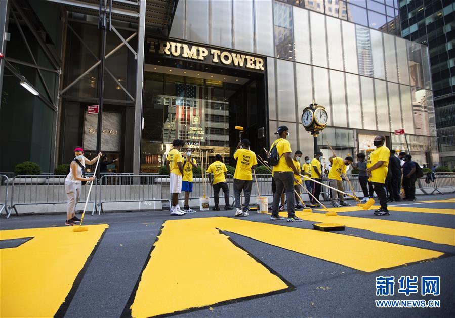 7月9日,在美國紐約第五大道特朗普大廈前,人們涂寫“黑人的命也是命”標語。當天,數十人在紐約第五大道特朗普大廈前的路面上涂寫“黑人的命也是命”標語。紐約市計劃在多處地點涂寫“黑人的命也是命”標語。新華社記者王迎攝