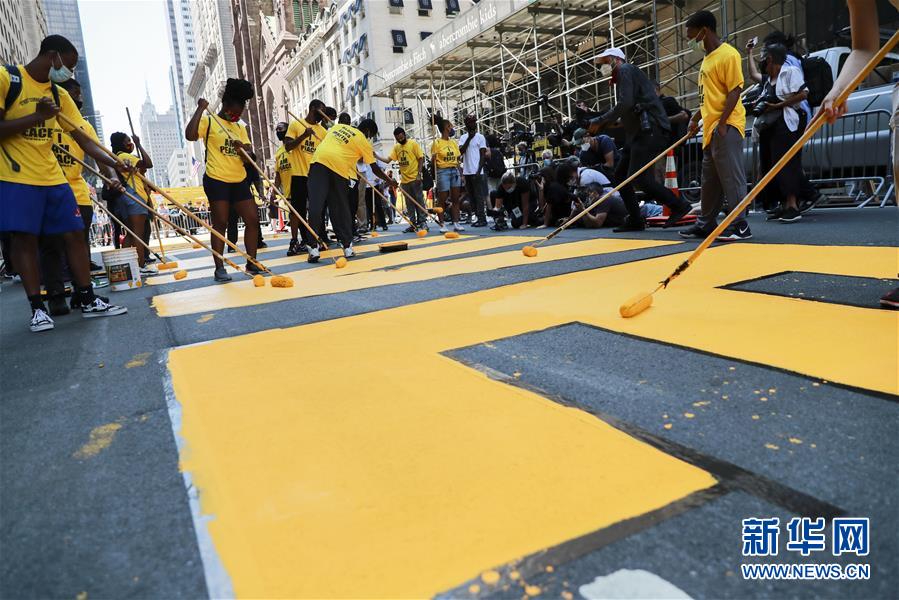 7月9日,在美國紐約第五大道特朗普大廈前,人們涂寫“黑人的命也是命”標(biāo)語。當(dāng)天,數(shù)十人在紐約第五大道特朗普大廈前的路面上涂寫“黑人的命也是命”標(biāo)語。紐約市計劃在多處地點涂寫“黑人的命也是命”標(biāo)語。新華社記者王迎攝