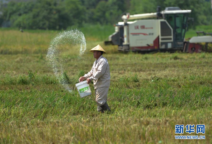 7月11日,村民在湖南省衡陽市衡陽縣臺源鎮(zhèn)臺九村收割后的稻田施肥,為種植晚稻做準備。近日,湖南各地農(nóng)村陸續(xù)進入“雙搶”季,農(nóng)民緊抓農(nóng)時,搶收搶種,力爭糧食穩(wěn)產(chǎn)豐收。新華社記者趙眾志攝