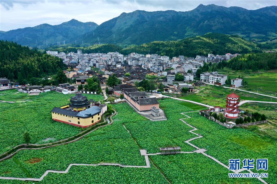 7月3日,浦源村鯉魚溪公園內(nèi)荷花盛開,吸引游人前來觀賞(無人機(jī)照片)。新華社記者 姜克紅 攝