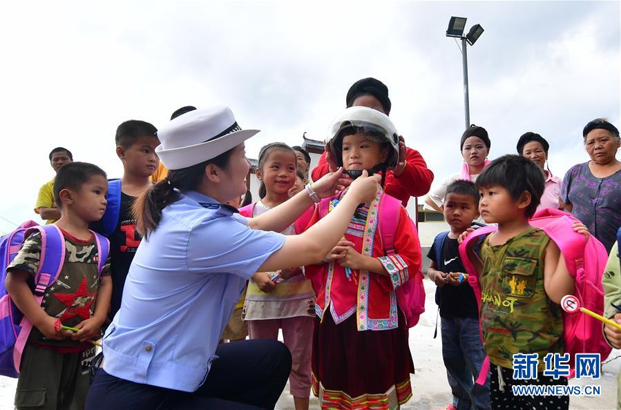 7月11日,柳州市交警支隊(duì)民警指導(dǎo)小朋友正確佩戴頭盔。當(dāng)日,廣西柳州市交警支隊(duì)的民警來到融水苗族自治縣大浪鎮(zhèn)大新村紅鄧屯教學(xué)點(diǎn),開展暑期交通安全教育活動,增強(qiáng)孩子們的安全出行意識。新華社記者黃孝邦攝
