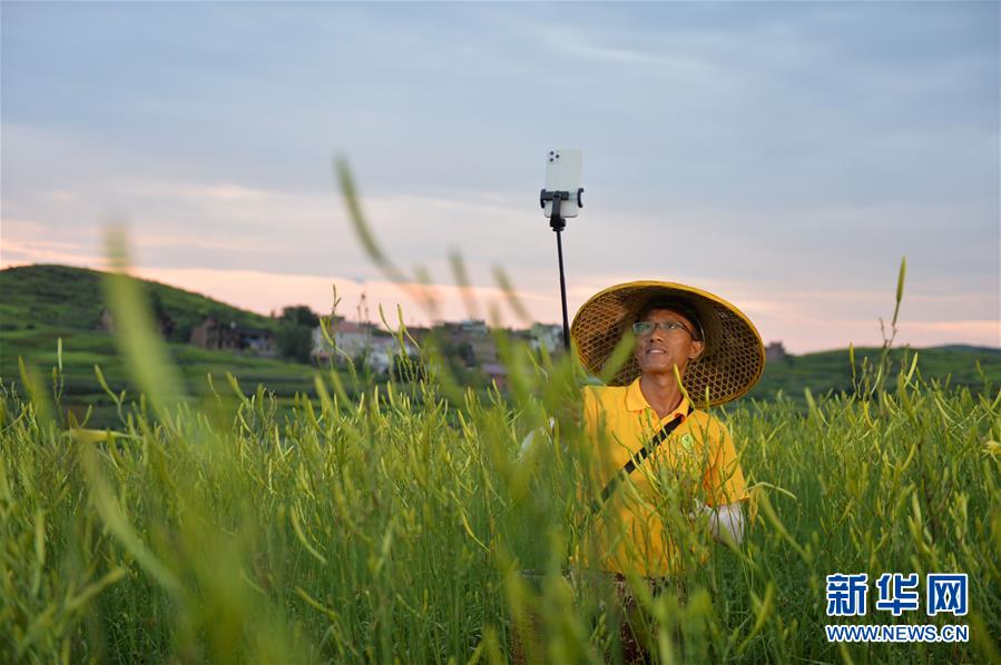 7月12日清晨,祁東縣官家嘴鎮(zhèn)草源沖村,一名菜農(nóng)在采摘黃花菜的間歇用手機進(jìn)行視頻直播。新華社記者 趙眾志 攝