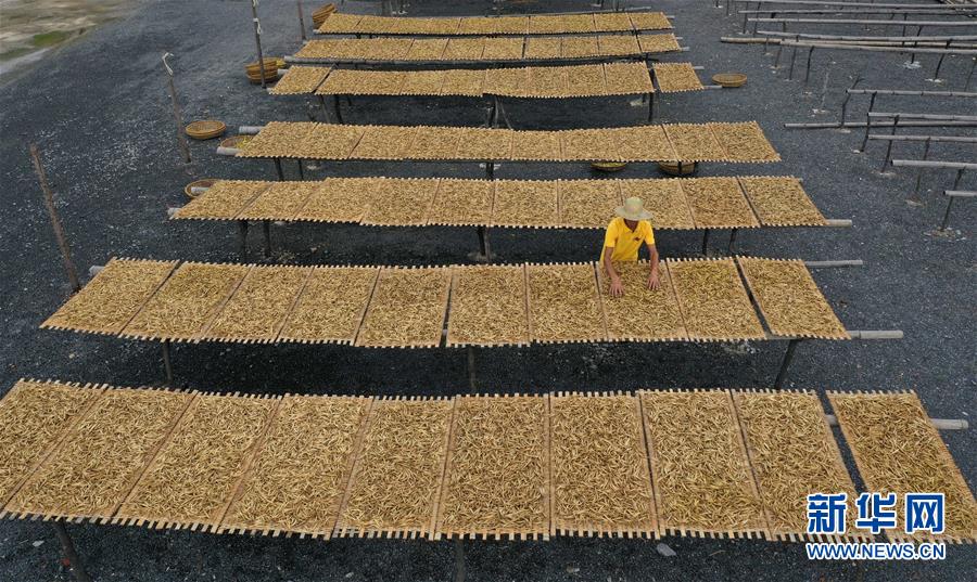 7月12日,祁東縣黃土鋪鎮(zhèn)雷公殿村,村民在晾曬黃花菜(無人機照片)。新華社記者 趙眾志 攝