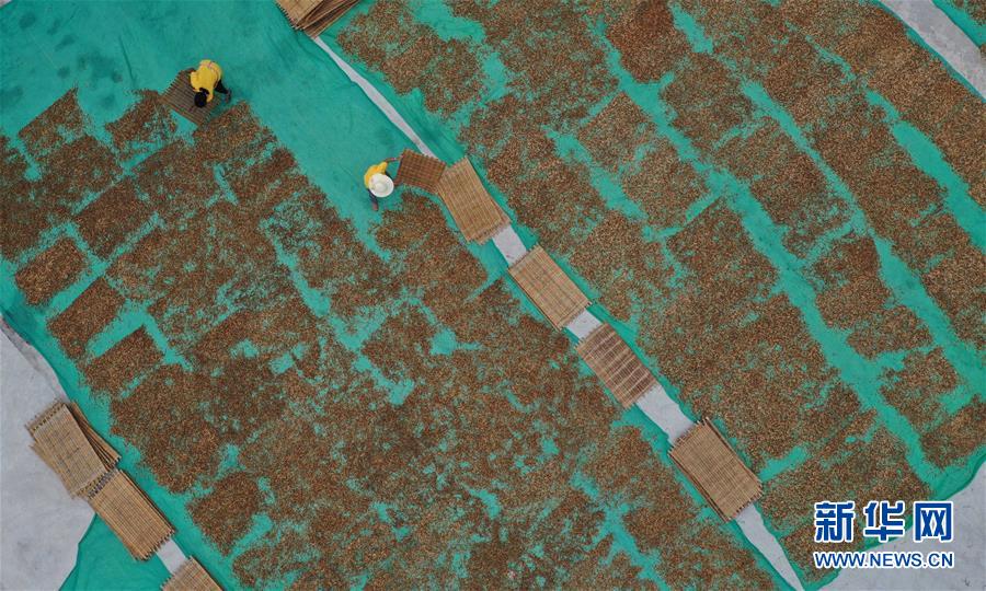 7月12日,祁東縣黃土鋪鎮(zhèn)雷公殿村,村民在晾曬黃花菜(無人機照片)。新華社記者 趙眾志 攝
