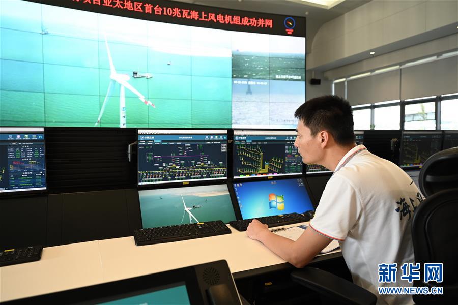 7月12日,三峽福建海上風(fēng)電集控中心工作人員在調(diào)試首臺(tái)10兆瓦海上風(fēng)電機(jī)組。記者7月13日從三峽集團(tuán)了解到,國(guó)內(nèi)首臺(tái)10兆瓦海上風(fēng)電機(jī)組日前在三峽集團(tuán)福建福清興化灣二期海上風(fēng)電場(chǎng)成功并網(wǎng)發(fā)電,這是目前我國(guó)自主研發(fā)的單機(jī)容量亞太地區(qū)最大、全球第二大的海上風(fēng)電機(jī)組,刷新了我國(guó)海上風(fēng)電單機(jī)容量新紀(jì)錄。新華社記者 林善傳 攝