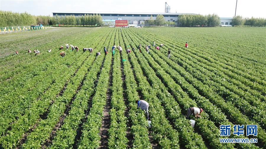 7月14日,在克東縣昌盛鄉(xiāng)青刀豆蔬菜種植示范基地,雇工在采摘青刀豆(無人機照片)。黑龍江省克東縣地處大興安嶺南麓,近年來,當?shù)卮罅Πl(fā)展扶貧產(chǎn)業(yè),探索“小院經(jīng)濟”、訂單種植和加工產(chǎn)業(yè)相融合新方式,帶動農(nóng)民就業(yè)和脫貧增收。新華社記者 王建威 攝