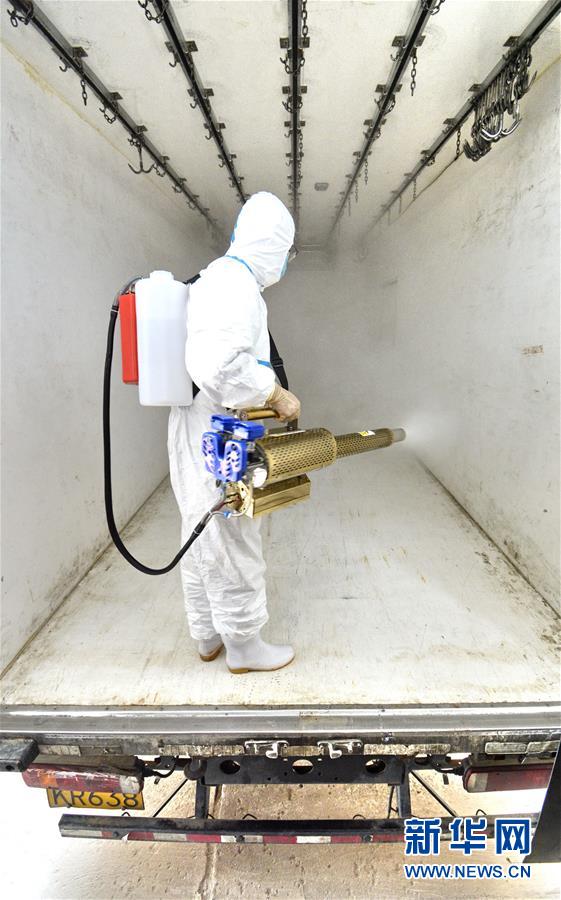 7月15日,北京二商肉類食品集團(tuán)有限公司員工對(duì)冷鏈運(yùn)輸設(shè)備進(jìn)行消毒。北京二商肉類食品集團(tuán)有限公司是保障北京肉類市場(chǎng)供應(yīng)的主要企業(yè)之一。新冠肺炎疫情以來,企業(yè)嚴(yán)格實(shí)施北京市、農(nóng)業(yè)農(nóng)村部和中國(guó)肉類協(xié)會(huì)的防疫要求,對(duì)進(jìn)入廠區(qū)的人員、車輛以及原料采購(gòu)、屠宰分割、產(chǎn)品加工、貯藏運(yùn)輸、廢棄物收集及污水處理等生產(chǎn)環(huán)節(jié)嚴(yán)格防疫,強(qiáng)調(diào)源頭把關(guān)徹底消毒。目前,集團(tuán)公司下屬多家生豬屠宰加工基地正常運(yùn)營(yíng),保質(zhì)保量供應(yīng)北京市場(chǎng)需求。新華社記者 李欣 攝