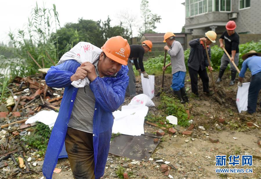 7月17日,防汛人員在秀洲區(qū)新塍鎮(zhèn)小金港村的河道邊加高堤防。浙江省嘉興市秀洲區(qū)處在杭嘉湖平原,受持續(xù)強(qiáng)降雨及上游排水影響,近期,秀洲區(qū)境內(nèi)的京杭大運(yùn)河分支航道持續(xù)保持較高水位。當(dāng)?shù)叵嚓P(guān)部門嚴(yán)陣以待,落實(shí)各項(xiàng)措施,確保安全度汛。新華社記者韓傳號(hào)攝