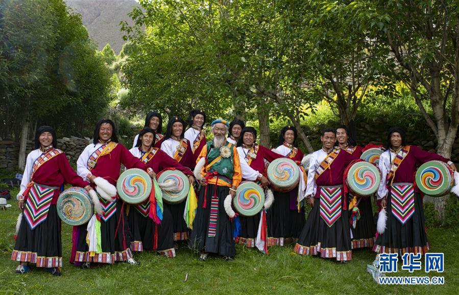 尼瑪老人(中)和他的弟子們合影(7月1日攝)。新華社記者普布扎西攝