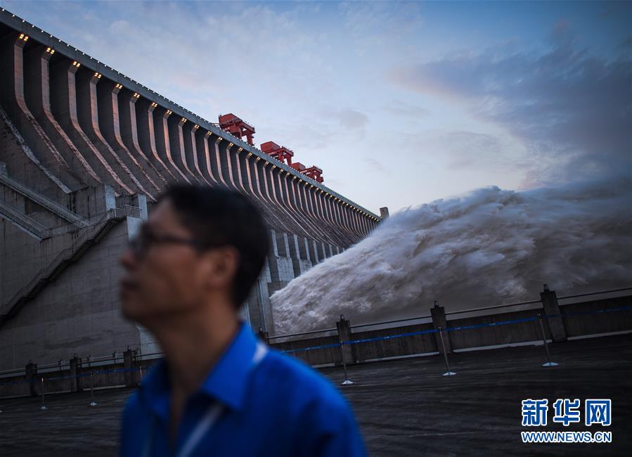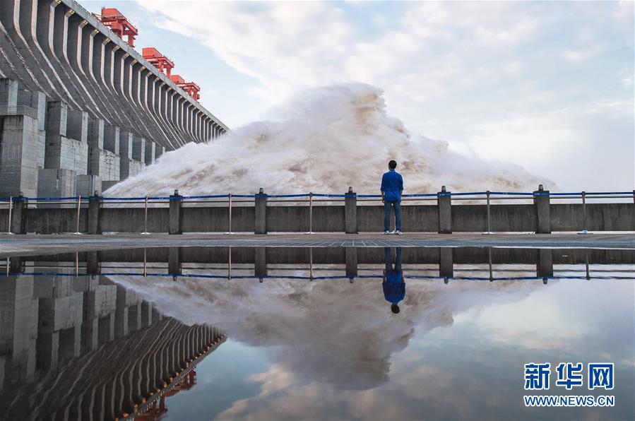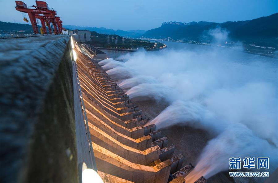 7月19日,三峽樞紐開啟泄洪深孔泄洪。19日20時,三峽水庫入庫流量4.6萬立方米/秒,較本輪洪水的峰值6.1萬立方米/秒下降了1.5萬立方米/秒?!伴L江2020年第2號洪水”平穩(wěn)通過三峽大壩。新華社記者肖藝九攝
