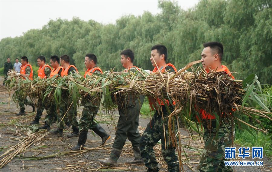 在鎮(zhèn)江市丹徒區(qū)世業(yè)鎮(zhèn)先鋒村西南大堤,中國(guó)安能集團(tuán)第二工程局常州分公司防汛前置備勤隊(duì)員準(zhǔn)備將捆好的蘆葦放在江堤邊(7月17日攝)。捆蘆葦護(hù)邊坡、機(jī)器人進(jìn)涵洞、“養(yǎng)水盆”防滲漏……在江蘇鎮(zhèn)江,當(dāng)?shù)馗刹咳罕姾蛯I(yè)力量,因地制宜就地取材,老辦法搭配新技術(shù),一批險(xiǎn)情得以消除在萌芽狀態(tài)。新華社記者季春鵬攝