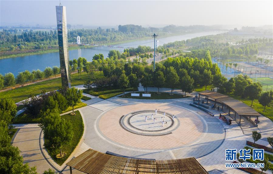 7月20日拍攝的河北省武邑縣觀津公園(無人機(jī)照片)。近年來,河北省武邑縣大力治理境內(nèi)舊河道,沿河栽種花草樹木、修建群眾健身步道等,打造“城市綠肺”,為市民提供休閑和親近自然的空間。新華社記者李曉果攝