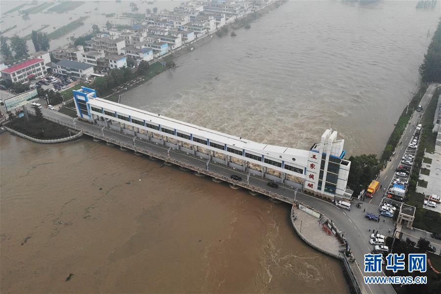 7月20日,洪水通過王家壩閘涌入蒙洼蓄洪區(qū)(無人機(jī)照片)。當(dāng)日8時32分,淮河干流王家壩閘開閘泄洪。受近期強(qiáng)降雨影響,淮河干流王家壩站水位19日快速上漲,7月20日6時36分水位漲至29.66米,超過保證水位0.36米?;春油跫覊伍l開閘泄洪,蒙洼蓄洪區(qū)啟用。新華社記者黃博涵攝